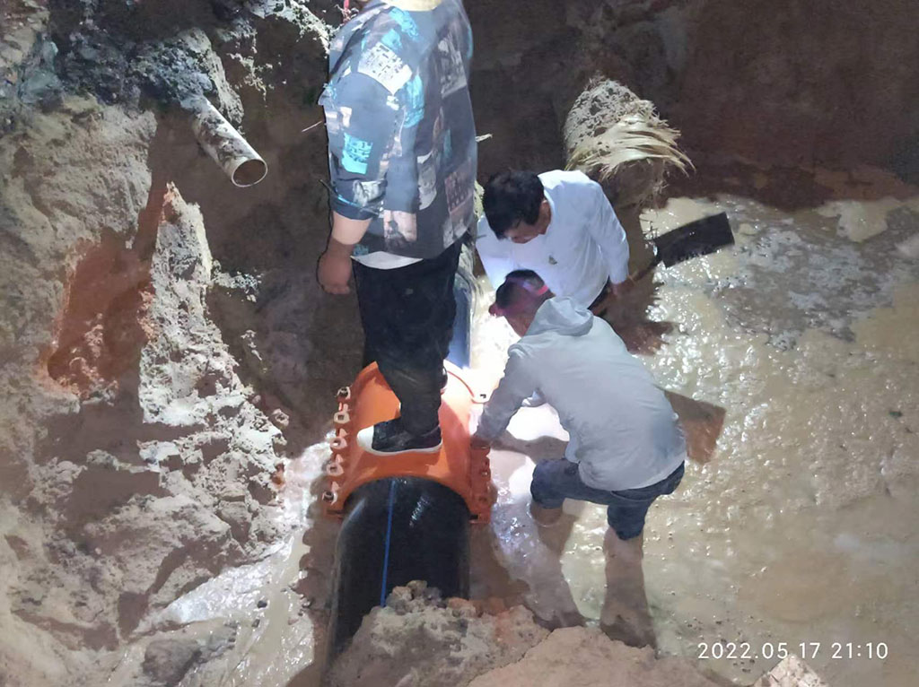 市路港公司獲悉后,第一時間組織工作人員趕赴現(xiàn)場配合施工人員進行搶修。我公司員工在對管道破損情況進行評估后,立即采取對污水管臨時封堵方法,保障通水正常及群眾出行。